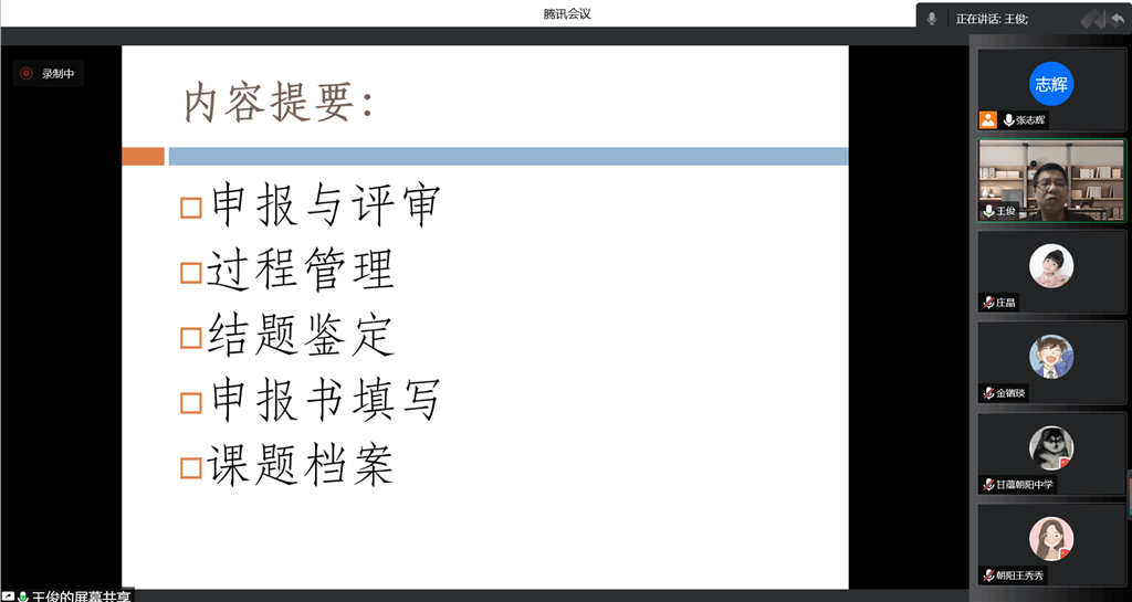 王博士以《省市教育科学“十四五”规划课题申报与管理简介》为题,申报与评审、过程管理、结题鉴定、申报书填写、课题档案个方面结合一个个具体的案例,对教育科研课题相关问题进行了专业细致的讲解和培训。
